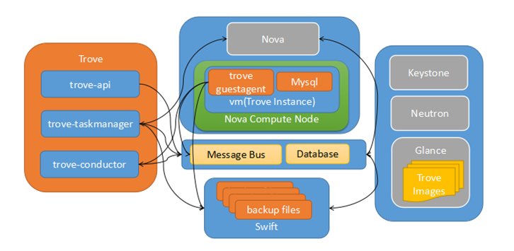 taskmanager会通过Nova、Swift的API访问Openstack基础的服务,而且是有状态的,是整个系统的核心。trove-conductor是guestagent访问数据库的代理层,主要是为了屏蔽掉guestagent直接对数据库的访问。